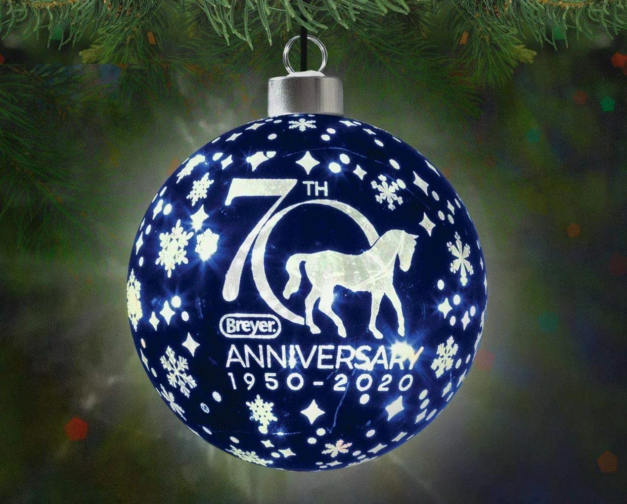 This special ornament with light was created to commemorate Breyer’s 70th anniversary. An impressive blue crystal ball is covered in engraved snowflakes and features the Breyer 70th anniversary logo. An on/off switch on the battery housing activates the LED lights inside. Powered by 2 x AAA batteries (not included).