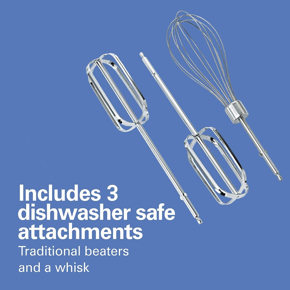 The Hamilton Beach hand mixer includes everything you need to start mixing. It comes with 2 dishwasher safe traditional beaters and a whisk. All the accessories store neatly in the snap-on storage case.