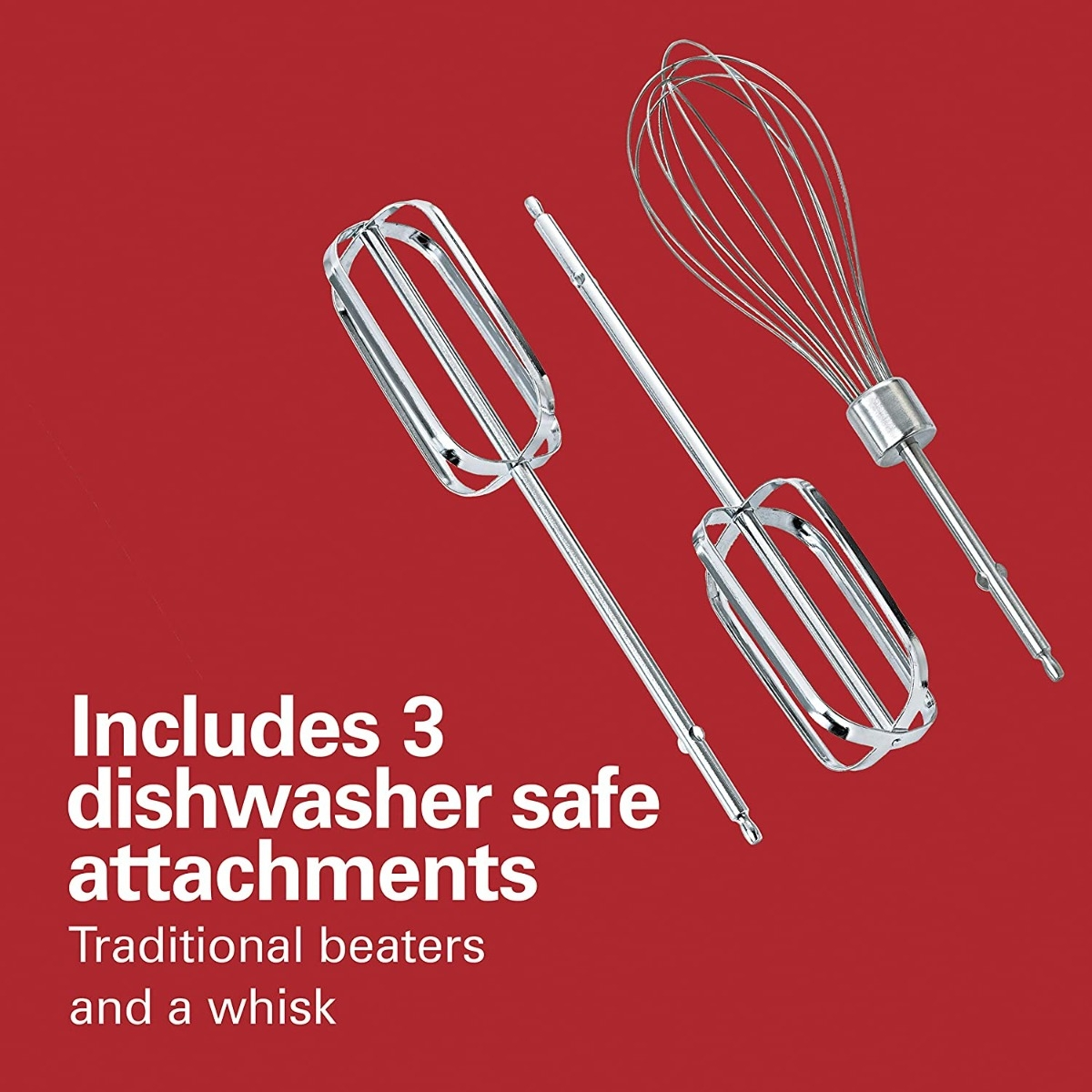 The Hamilton Beach hand mixer includes everything you need to start mixing. It comes with 2 dishwasher safe traditional beaters and a whisk. All the accessories store neatly in the snap-on storage case.