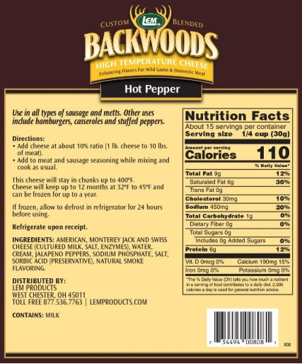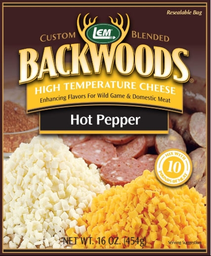 Our Backwoods high temperature cheese is a great item for sausage making. Add cheese to your sausage and give it something extra. Cheese will stay in chunks up to 400 degrees. Add about 10% cheese (1 lb. of cheese to 10 lbs. of meat). Cheese will last up to 12 months at 32 degrees F to 45 degrees F and can be frozen. Add to meat and sausage seasoning while mixing, and cook as usual. Comes in 1 lb. bags in cheddar, hot pepper, swiss and mozzarella flavors. Gluten free. Refrigerate upon receipt.