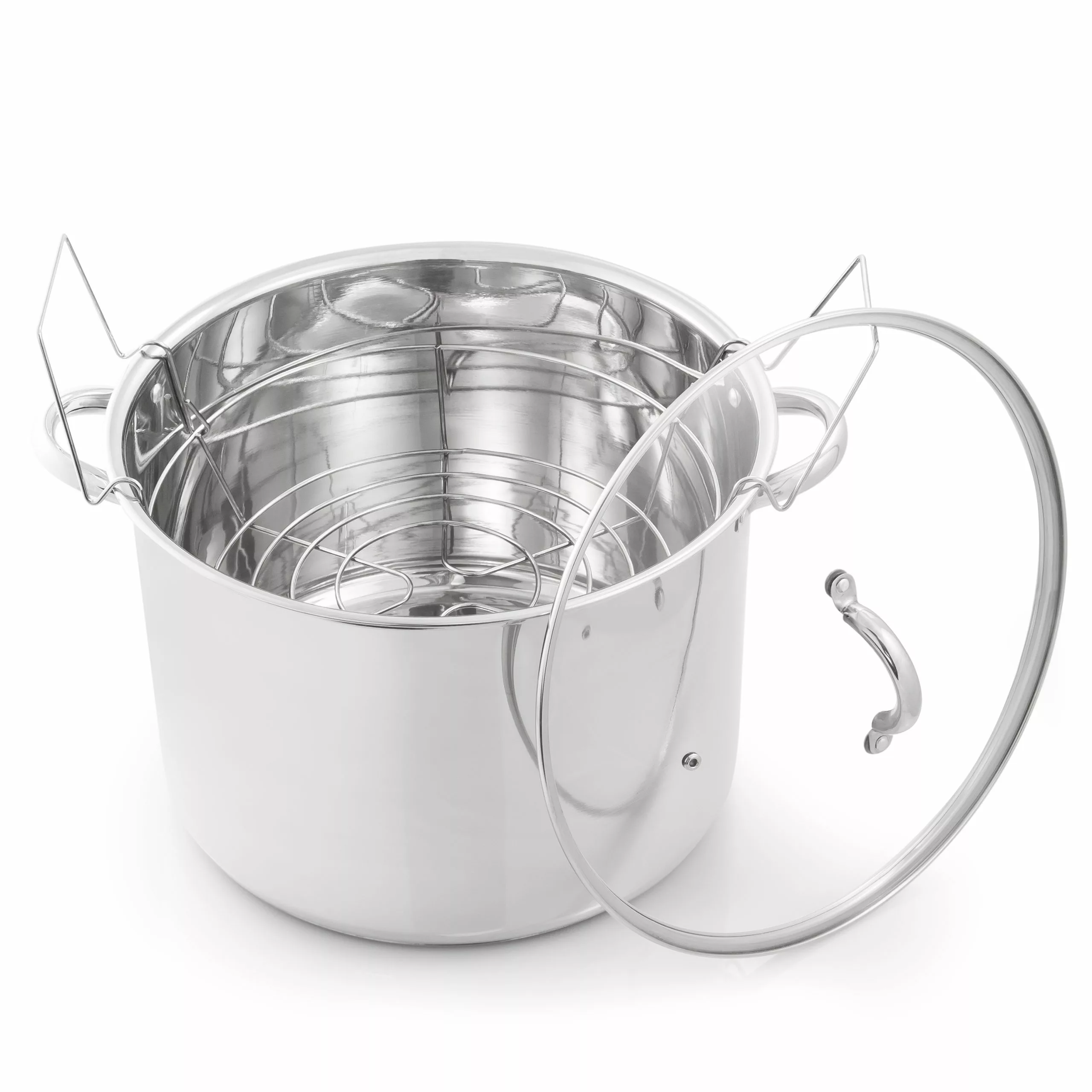 Expand your culinary capabilities with the Prep-N-Cook Stainless Steel 21.5 qt. Canner. This premium set ensures that you can confidently can, even if you aren’t a natural Martha Stewart in the kitchen. Use the set to prepare and store your favorite preserves, jams, soups, and more in convenient jars for future consumption. The set includes a massive 21.5-quart pot, giving you the ability to can in quart, pint or half-pint sizes. The stainless steel construction and encapsulated bottom is durably built and will work on gas, electric and ceramic/glass stove tops.
