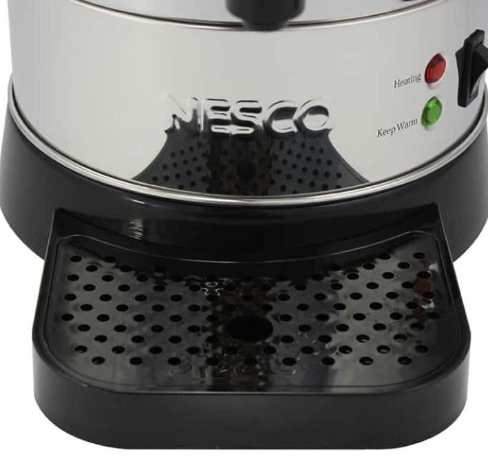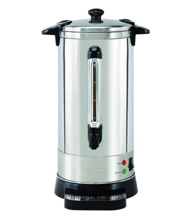 The NESCO 50 Cup Coffee Urn is perfect for large social gatherings, business meetings or family parties. Its hefty capacity can hold up to 50, 5.7 oz. cups. Approximate brewing time is one cup per minute. The stainless steel urn base features a double insulated wall that retains heat and has a 950 watt heating element that will keep your coffee hot and fresh for hours of enjoyment. The easy-to-use dispenser and drip-free spout with continuous pouring option provides a perfectly poured cup of coffee every time. The ready-to-serve indicator light will illuminate green when coffee is ready to be poured and enjoyed. The coffee level indicator visually shows how much coffee is left in the urn. A convenient drip tray collects splashes and spills ensuring a clean countertop. The stainless steel coffee basket is removable and dishwasher safe making cleanup easy and quick. Additional features include water level marks for easy filling and stay-cool handles to help prevent mishaps. The NESCO 50 Cup Coffee Urn a real crowd pleaser that keeps coffee fresh and flavorful all day long.
