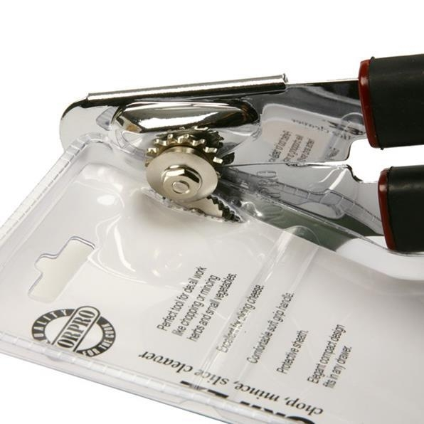 Big, cushioned handles give you extra strength to pierce a can. Double geared mechanism with sharp hardened steel blade. The handle has a patented shape, ergonomically designed to fit perfectly for right or left hand use. Oversize handle and finger indents give a great hold without strain and keeps hands clear of the tool’s functional surface.