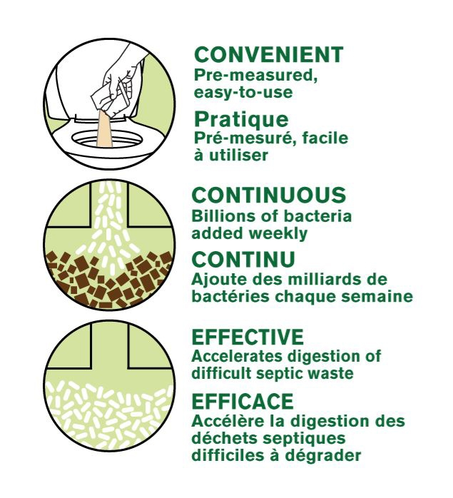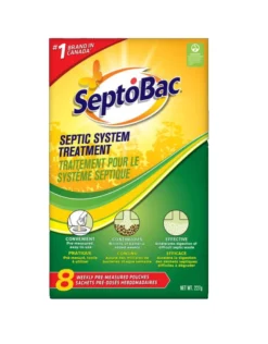 The #1 brand of septic system treatment in Canada*, SeptoBac® offers this ECOLOGO certified, easy-to-use weekly septic tank treatment. Each pouch contains a concentrated formula with billions of specialized enzyme-producing bacteria which digest organic and difficult-to-degrade septic waste. SeptoBac also contains microbial nutrients to stimulate bacterial growth and help maintain a healthy septic system.