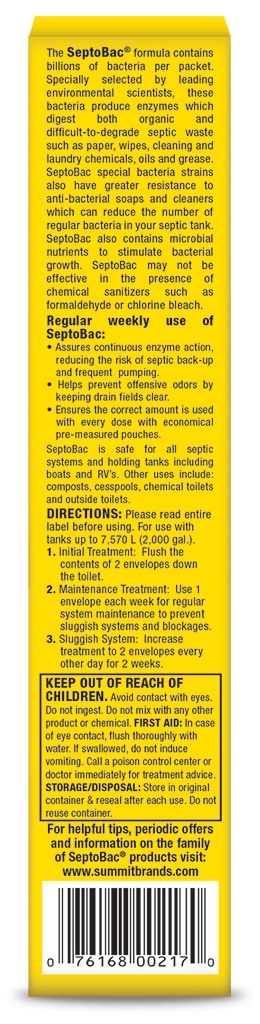 Effective: The bacteria in SeptoBac septic tank treatment are specially selected by leading environmental scientists to be effective under a wide range of waste and septic system conditions. Billions of bacteria in each gram of SeptoBac powder digest both organic and difficult-to-degrade septic waste such as paper, wipes, cleaning and laundry chemicals, oils and grease. SeptoBac also contains microbial nutrients to stimulate and strengthen regular bacteria levels.