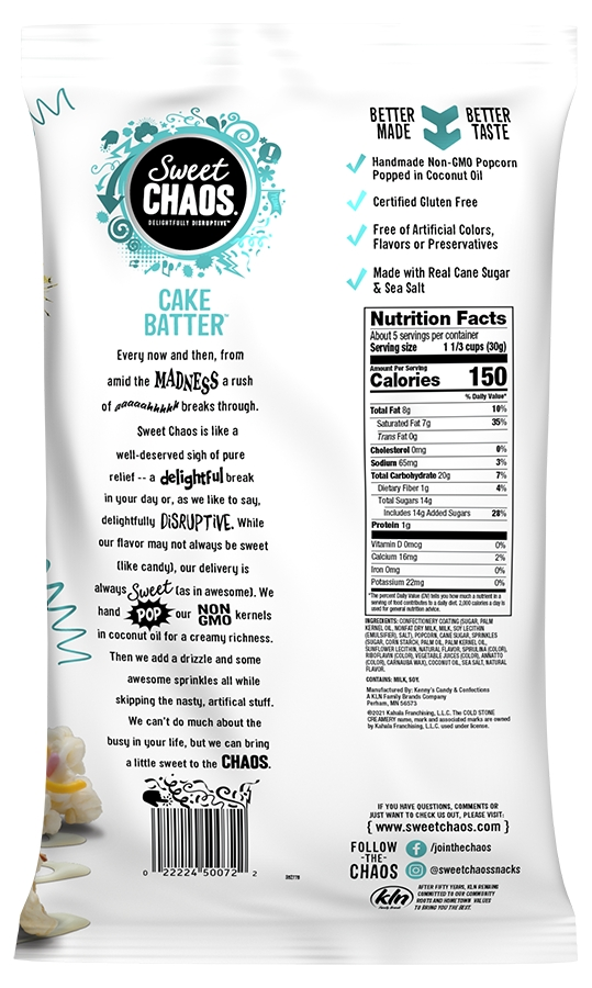 Every now and then, from amid the MADNESS a rush of aaaaahhhhh breaks through. Sweet Chaos is like a well-deserved sigh of pure relief – a delightful break in your day or, as we like to say, delightfully disruptive. While the flavor may not always be sweet (like candy), the delivery is always sweet (as in awesome). Sweet Chaos hand POPs their NON-GMO kernels in coconut oil for a creamy richness. Then they add two drizzles all while skipping the nasty, artificial stuff. While much can’t be done about the busy in your life, Sweet Chaos can bring a little sweet to the CHAOS.