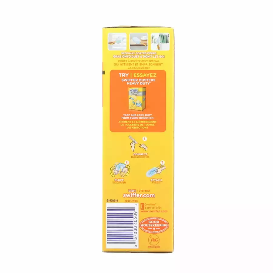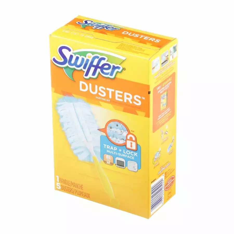 Swiffer Duster starter kit includes 1 handle and 5 dusters. The duster’s fluffy fibers capture dirt, allergens and particles and locks them away.